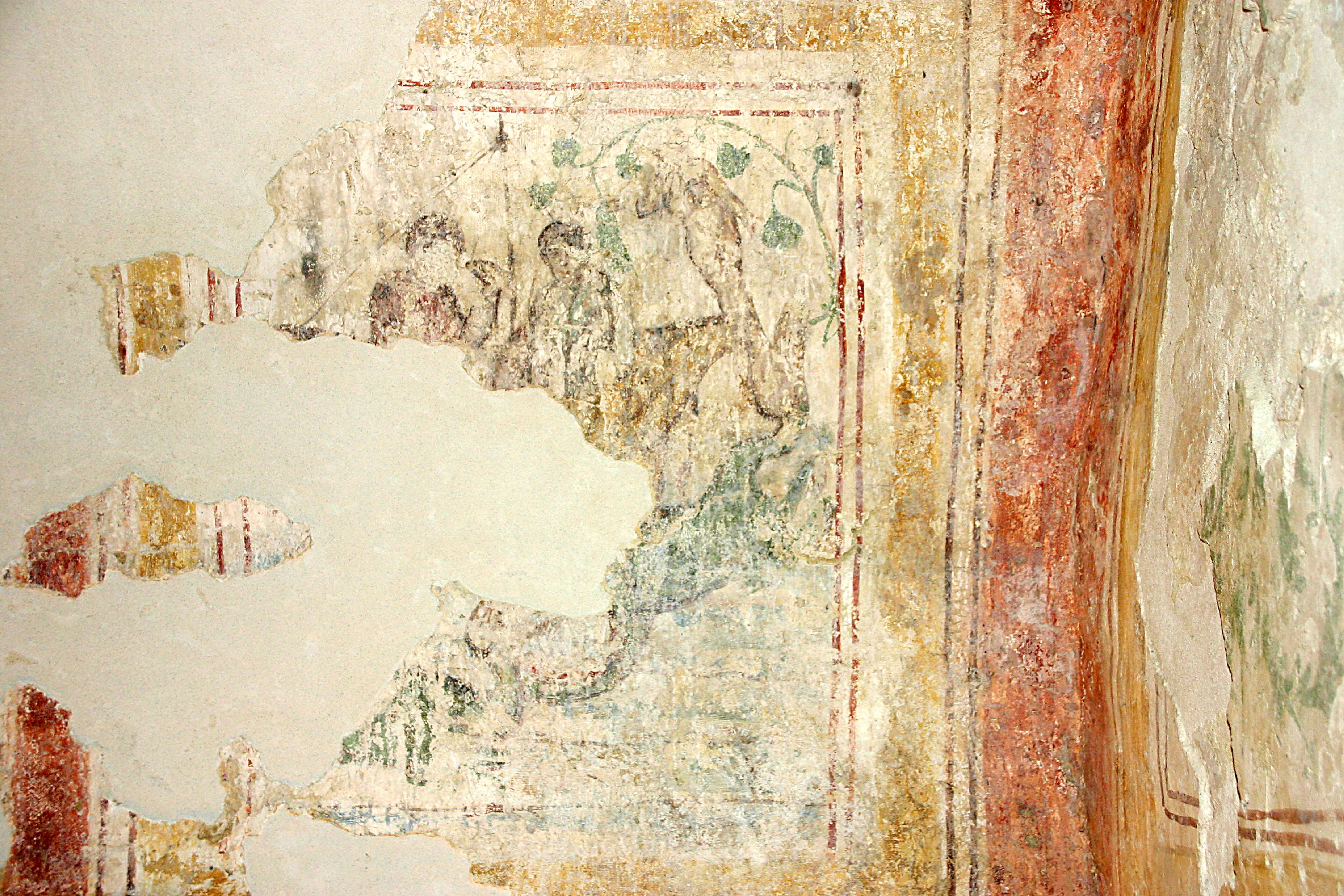 Itt a festő a próféta vízbe vetését és növény alatti pihenését egyetlen képkeretben ábrázolta. Jónást két hajós a lábánál fogva bedobja a tengerbe, feltehetőleg a cet szájába, amint az a hiányzó részlet ellenére a szörny testhelyzetéből kikövetkeztethető. A kép a cet fejénél sérült, de jól látszik a lény villásan végződő, kacskaringós farka, mely a vízből kiemelkedve érinti a hajó orrát, valamint bal mellső és két hátsó lába (uszonya) is. Ezek a hagyományos, sárkányszerű cetábrázolás jellemzői. Vélhetően a cet feje is sárkányszerű volt, mint annyi más freskón és számos szarkofágon.