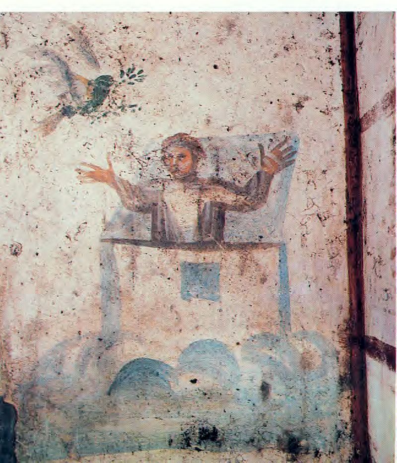 A galamb első elküldésének értelmezése szintén elveszett. A második elküldés annak az evangéliumi eseménynek az előképe, amikor Jézus elküldi a hetven (más változatokban hetvenkettő – Lk 10. fejezet) tanítványt, akik azzal térnek vissza, hogy Jézus nevére még az ördögök is engedelmeskednek. A galamb tehát a Szentlelket, az olajág a Szentlélek gyümölcsét, erejét jelképezi, amelynek még a tisztátalan lelkek sem tudnak ellenállni. A galamb először nem talál biztos talajt, vagyis a Szentlélek nem marad meg a tanítványokban, mert később elhagyják Jézust. Hilarius talán arra utal ezzel, hogy a kafarnaumi zsinagógában mondott beszéde után Jézust az apostolokon kívül szinte mindenki elhagyta (vö. Jn 6,66). Később Noé ismét elküldi a galambot, azaz Jézus a Szentlelket, aki immár örökké ott lakozik a hívő ember szívében (vö. Jn 14,16). Egy sírkamra falára talán ez utóbbi értelemben kínálkozik a jelenet. Hilarius a későbbi eseményeket is értelmezi: a Noé által telepített szőlő a zsidóságot jelképezi, a bor és a részegség Jézus vérét és kínszenvedését, Noé mezítelensége Jézus halálát, amelyet a Kám jelképezte pogányok kinevetnek, a Szem által szimbolizált zsidók azonban betakarnak, mert ők megtartják a törvényt. Jáfet pedig, aki Szem házában lakik, a keresztényeket jelképezi, akik Isten kegyelmének részesei.
