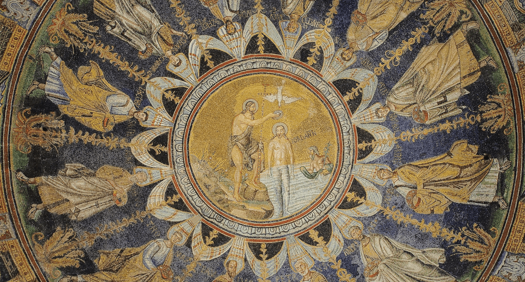 Az ún. „Neon Keresztelőkápolna” (Battistero Neoniano) Ravenna legrégebbi építménye, amely részben egy római fürdőre épült. Ortodox keresztelőkáponának is hívják, megkülönböztetve az ariánusok keresztelőkápolnájától, amelyet Theodoric / Theuderik osztrogót király építtetett mintegy 50 évvel később. A nyolcszögalapú téglaépületet még Ursus püspök emeltette a 4-5. század fordulóján, de Neón püspök fejezte be az 5. század végén. Ekkor készült a mozaikdíszítés is. A mennyezeti mozaikon a szakállal ábrázolt Jézust kereszteli János a Jordánban. A folyót megszemélyesítő alak egyik kezében nádszálat tart, a másikban ruhát.